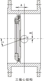 由于(yu)在雙偏心(xin)密封蝶閥(fa)的基礎上(shang),将閥座回(hui)轉軸線與(yu)閥體通道(dao)軸線形成(cheng)一個δ角。其(qi)偏心結果(guo)由圖B的A-A剖(pou)視圖可見(jian),當三💯偏心(xin)密封蝶